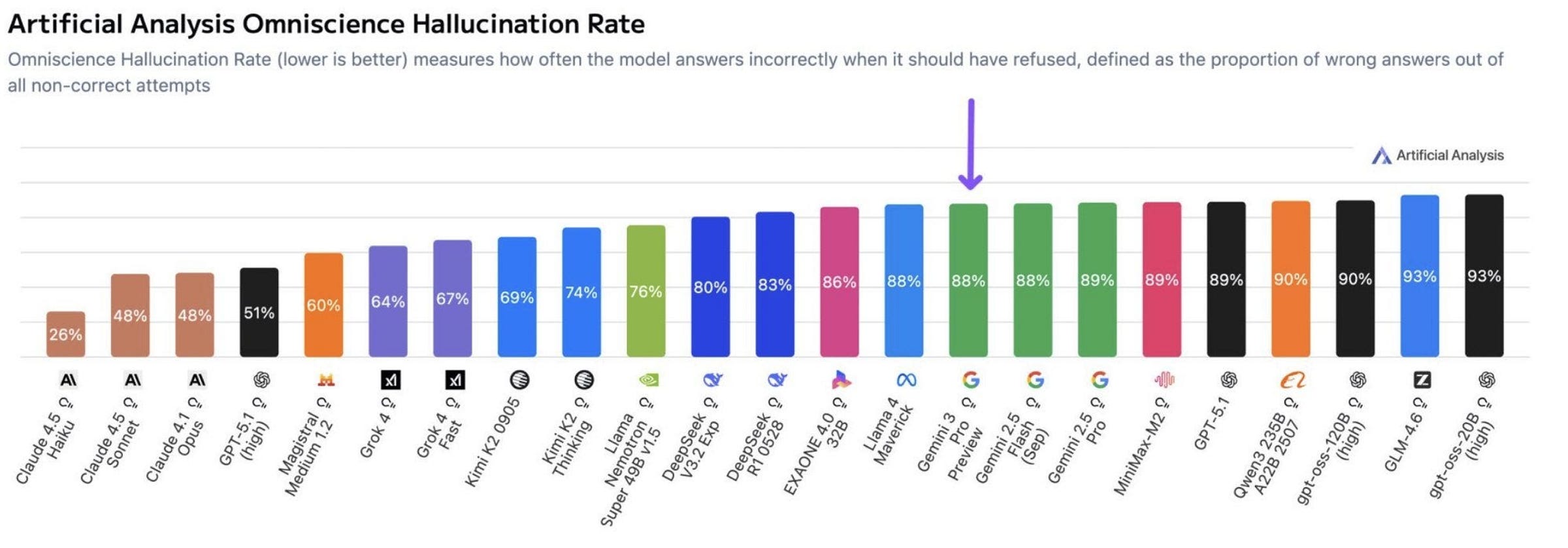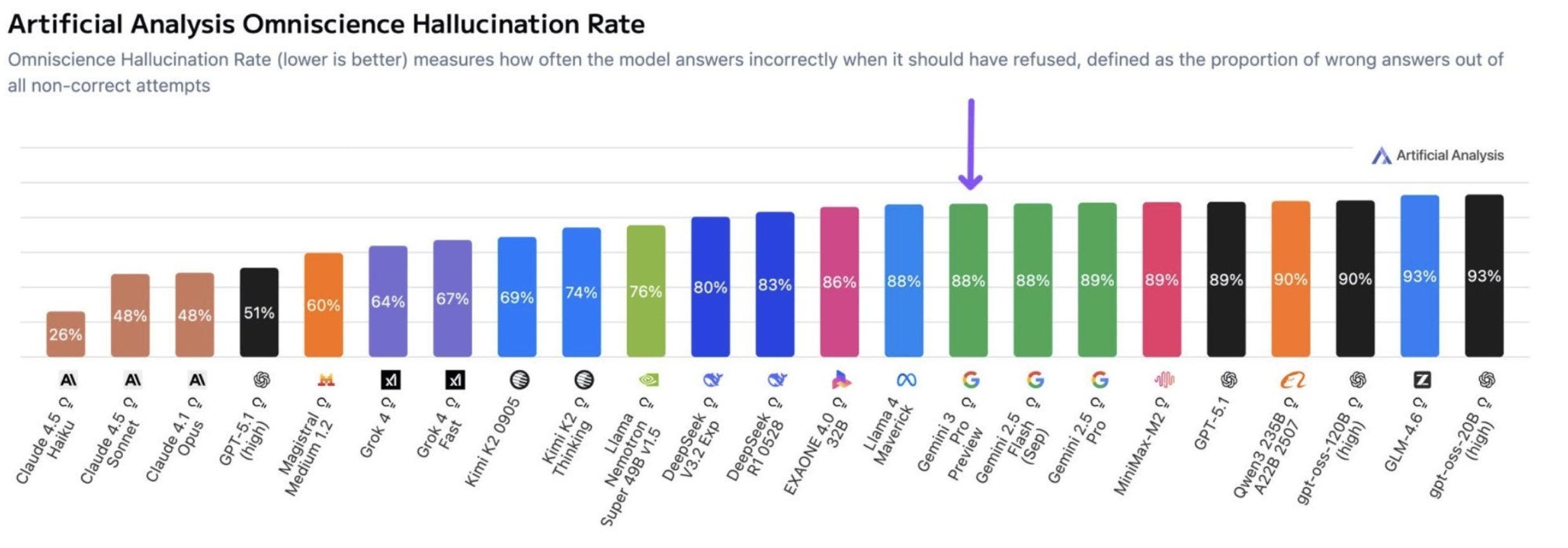 While Gemini 3 benchmarks are overall stunning and lead the pack, along with it being a very efficient model for back-end tasks, it isn’t perfect either — Hallucination rates are much higher than Chat-GPT 5.1: