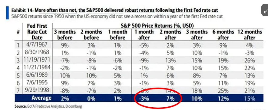 Since early August, we’ve described our market view as ‘choppy but trending higher,’ likely resolving in a bigger move up. That’s mainly been a result of the table below, which shows that in 6 out 7 rate cut cycles which have avoided recessions, the market has been down in the following month, with the only winner up a measly +1%.