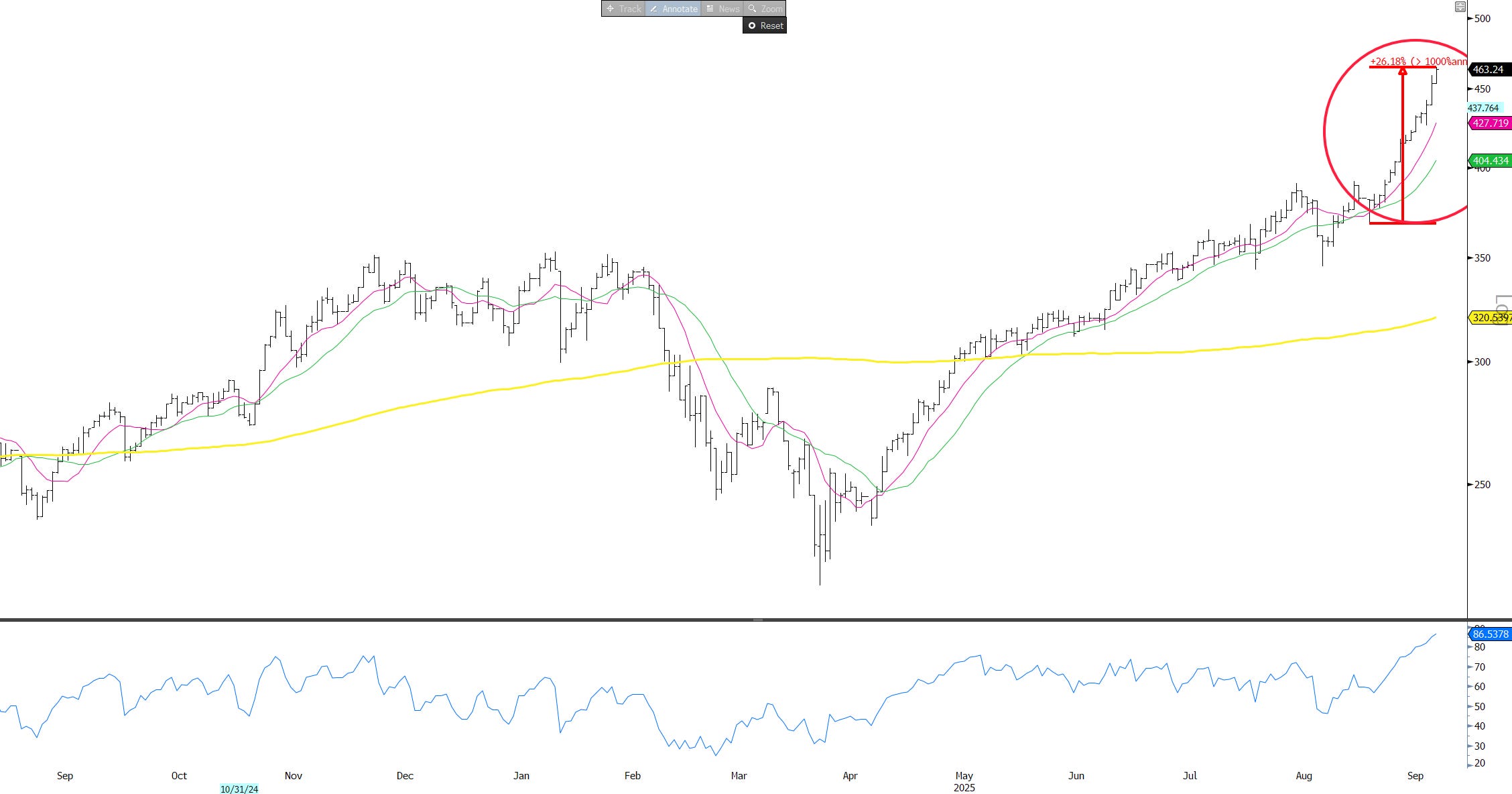 In sum: the ingredients are there for a short pullback in the next two weeks. But it’s important not to lose sight of the bigger picture: we’re entering a bullish rate cut cycle, the AI supercycle continues to ramp, charts look really good (although some very extended), and price action continues to point to a bigger move up. That’s why we like using short-dated puts — every 20bps of premium allows for 10% short exposure. Worst case: we lose some premium. Best case: it allows us to stay long and continue to play offense.