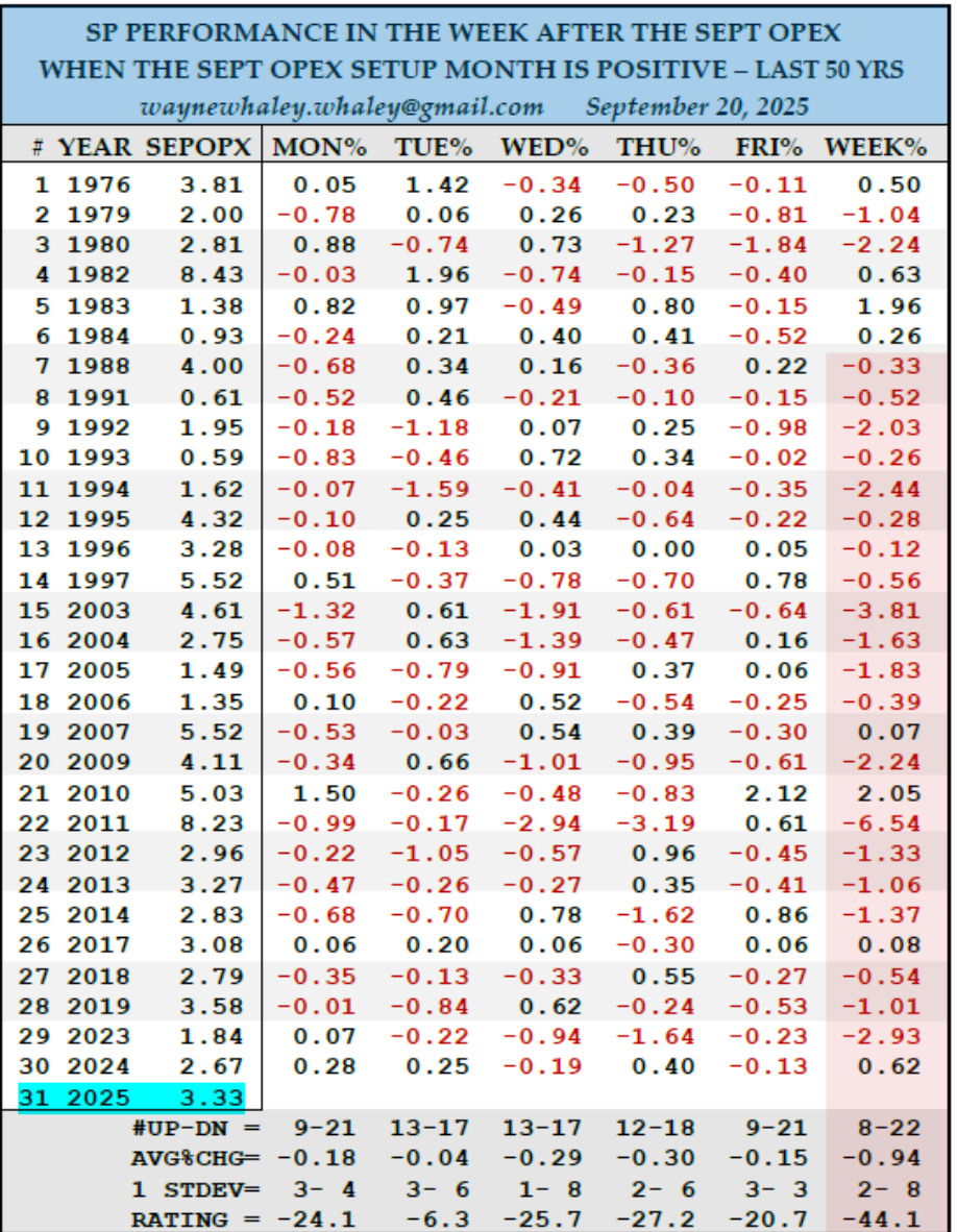 Third, we’re in a post-opex week which is usually a good window for weakness. Over the last 40 years, when the Sept Opex month has been positive, the Sept Post Opex week is 4-20 with an avg loss of 1.18%: